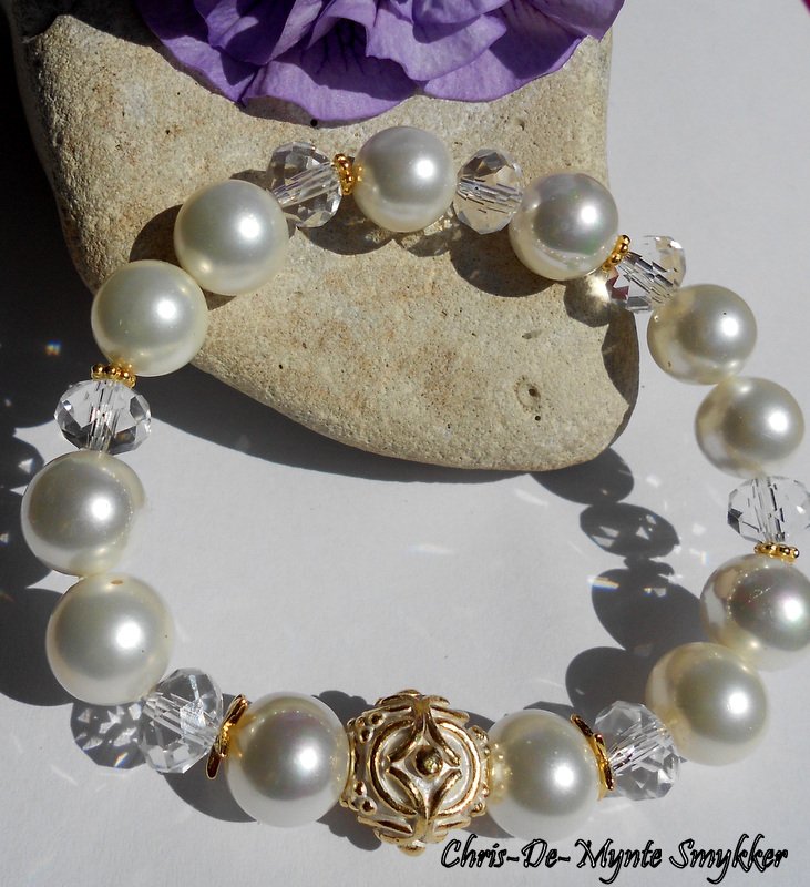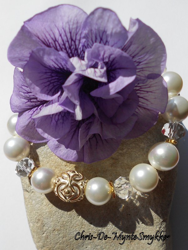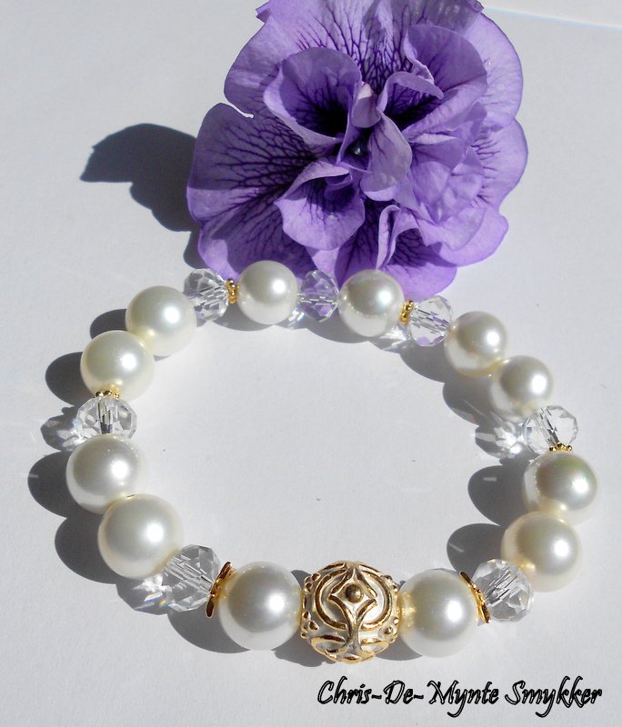 Smukt armbånd designet med 10 mm hvide Shell perler, guld stjerne blomster, klare facet krystaller, små fine guld blomster, og i midten af armbåndet er deren 12 mm smuk guld perle med flot mønster i guld og hvid.