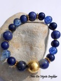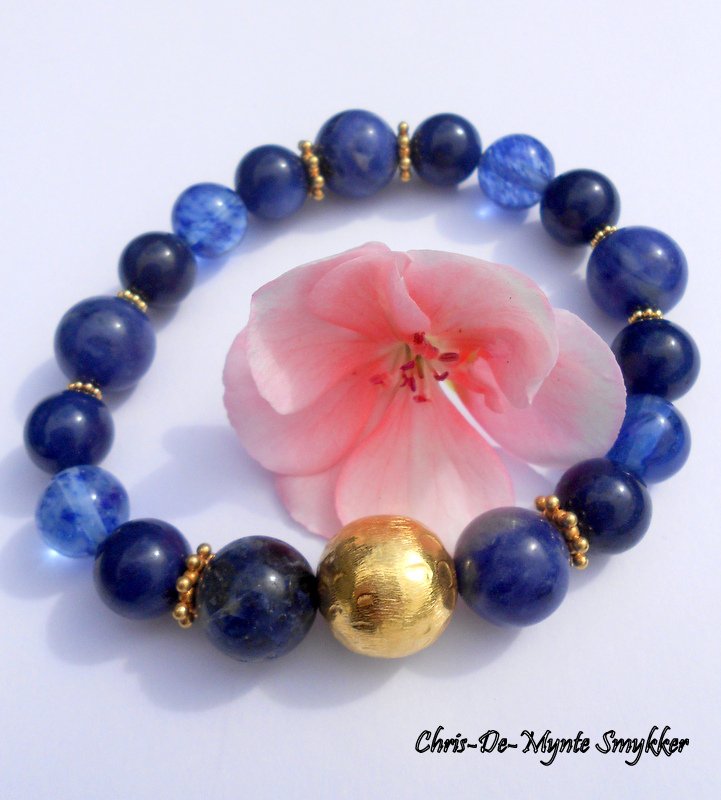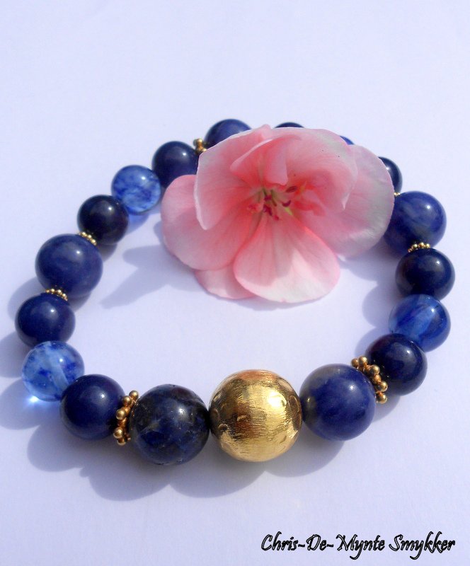 Smukt armbånd i guldbelagt sølv, designet i blånuancer og med 12 mm Sodalite, 10 mm blå Jade, 10 mmm Blåbær Kvarts, små blomster, snefnug og en hammeret 14 mm perle i midten af armbåndet i guldbelagt sølv.