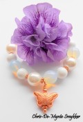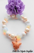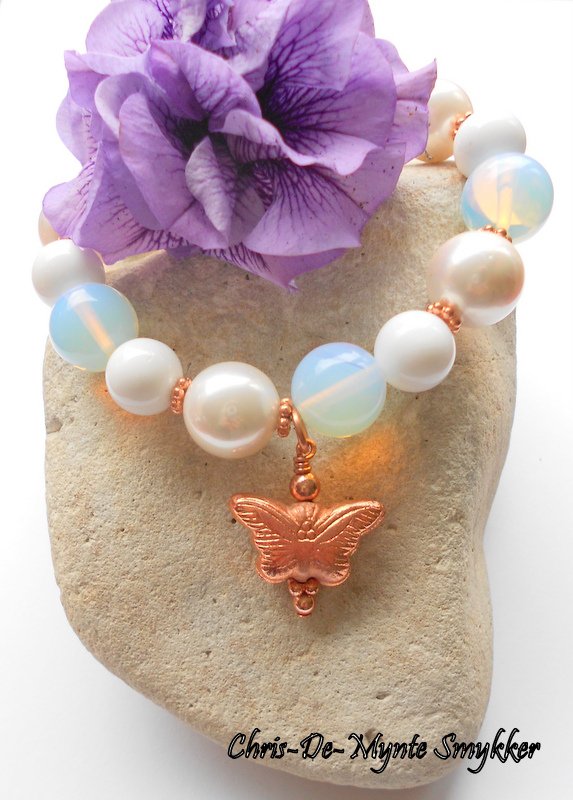Smukt kobberarmbånd i hvide nuancer, designet med 12 mm hvide Sea Shell perler, 12 mm mælkehvide Opalit kvarts, 10 mm hvide Jade perler, små kobberblomster og et vedhæng med en flot kobber sommerfugl.