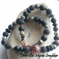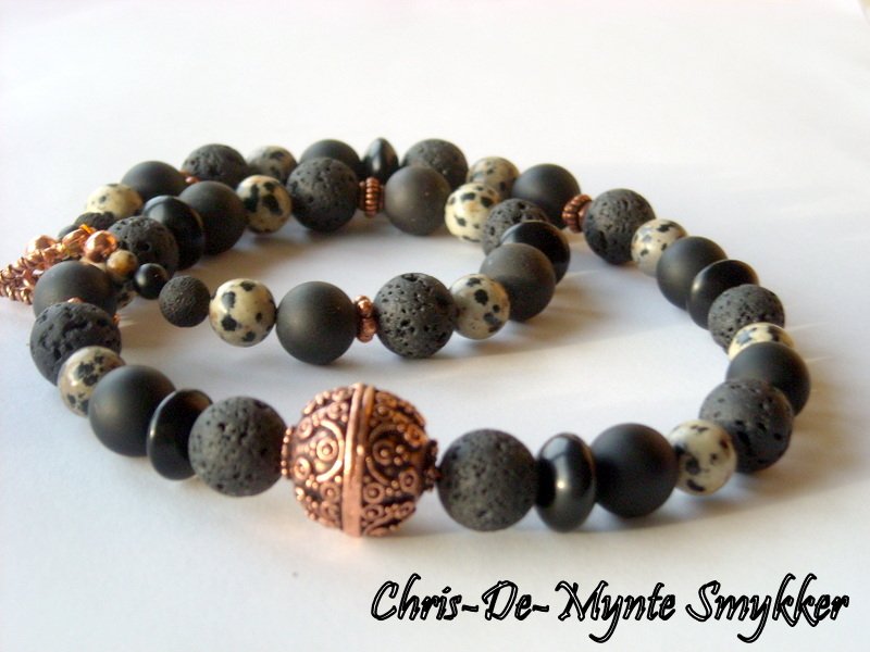 Smuk kobber halskæde, designet med sorte mat slebede Agater, sorte Lava, en flot 14 mm kobberperle med smukt mønster, kobber blomster, Dalmentiner Jaspis, kobberperler med mønster, og sorte Onyx rondeller.