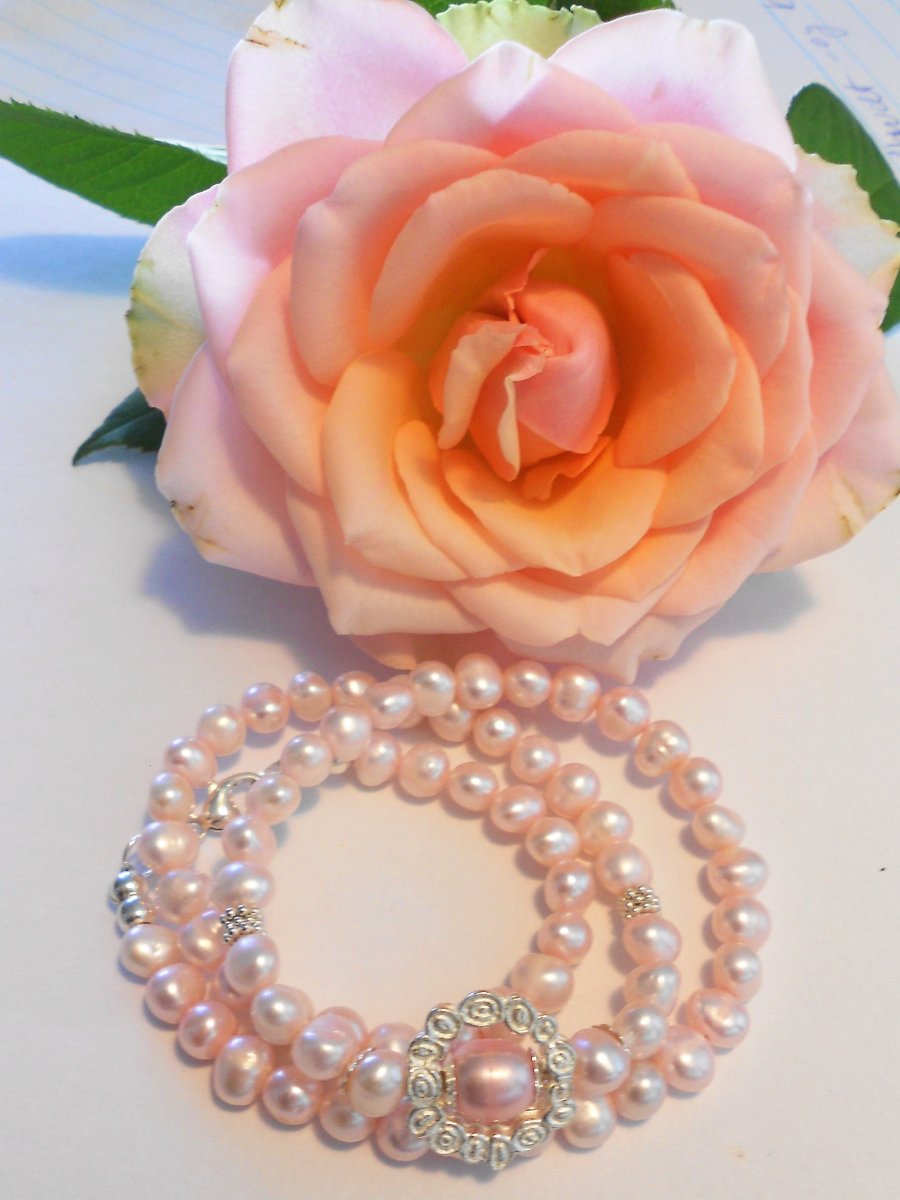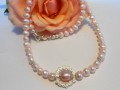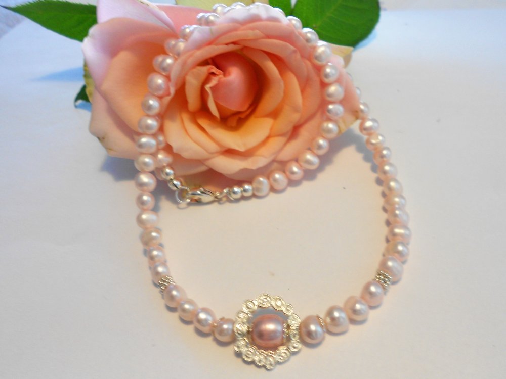 Unika halskæde designet med smukke lyserøde ferskvandsperler, små sølv blomster, sølv perler, og en sølv rosenkrans med en flot lyserød ferskvandsperle i midten pyntet med sølv kapper.