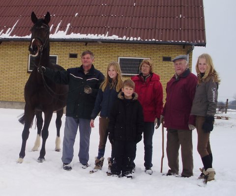 Hele familien samlet med bronzemedalje hoppen Donna Carola.