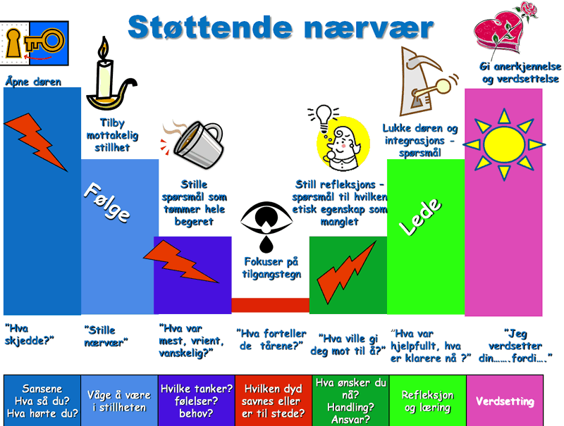 Når noe kraftig og vanskelig i livet har skjedd er det veldig helbredende å få lov å ”tømme” seg til et menneske som er nærværende, støttende, lyttende med fokusert oppmerksomhet. Det å ha slike mennesker i sin nære vennekrets er en stor skatt for seg selv, og det å mestre en slik kommunikasjonskunst er en skatt for andre. Dette krever en ydmyk holdning av den som praktiserer støttende nærvær at den som har erfart det vanskelige også selv har svarene og løsningene dypt i sitt indre. Det handler om å være nærværende og lyttende å stille åpne spørsmål til den som har erfart den vanskelige hendelsen. Linda Kavelin Popov og Dan Popov i ” The Virtuesprojekt” har utviklet en enkel fremgangsmåte for å mestre denne kunsten som de har kalt: ”Støttende nærvær”.