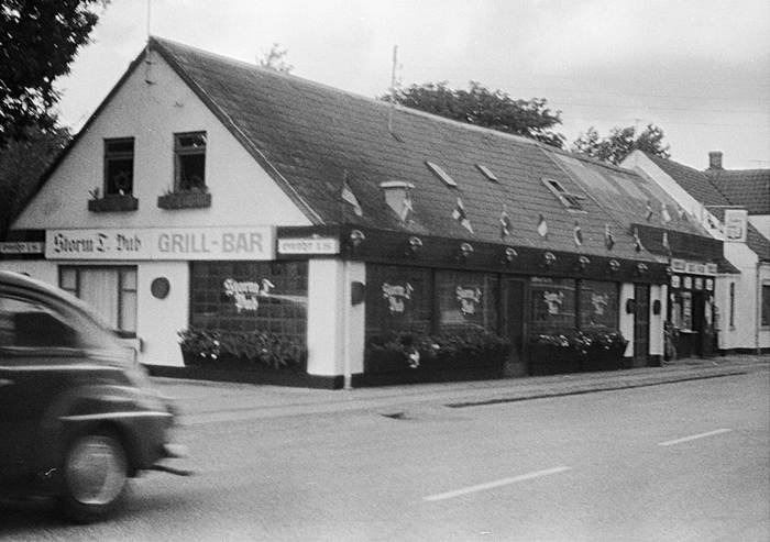 Med hensyn til grillbaren ved siden af, så har Bjørn sendt mig et sjovt billede af Grill Snack. På væggene udenfor hænger reklameskilte, bl.a. en hot dog med noget der ligner Fedtmule inden i og et skilt til højre, som til forveksling ligner Anders And. Også her kunne man forvente problemer med copyright, men Disneykoncernen rettede nu aldrig søgelyset mod Farsø, så de flotte tegninger, som Poul Haman selv havde lavet, fik lov at leve deres eget liv i Vesthimmerland.