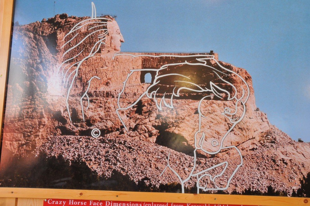 Ansigtet på Crazy Horse er færdigt, og man er nu i gang med hans arm,som skal pege ud over Black Hills - indianernes land. På bjerget har man optegnet konturerne af den hest, som Crazy Horse rider på. Når det hele står færdigt om måske 100 år, vil skulpturen være mere end 200 meter lang og 175 meter høj - den største i verden.