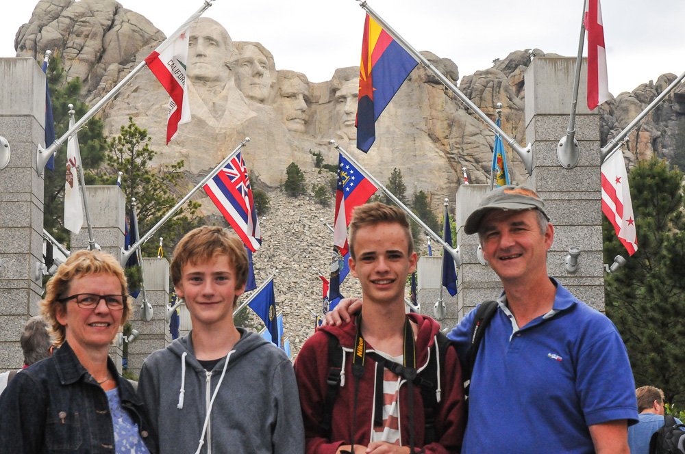 Det sidste stykke op mod Mount Rushmore var spændende: Hvornår ville de fire markante ansigter dukke frem? Morten spottede dem først, men vejen svingede og de forsvandt af syne. Det gjorde de dog ikke, da vi havde sat bilen i det store parkeringshus, som er bygget ved bjerget. Via et flot indgangsparti gik vi op gennem en flagallé med de amerikanske staters flag, medens præsidenterne i baggrunden betragtede det hele med ansigterne lagt i stenfolder.