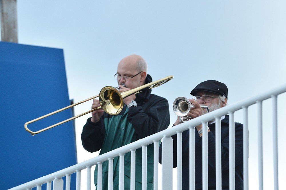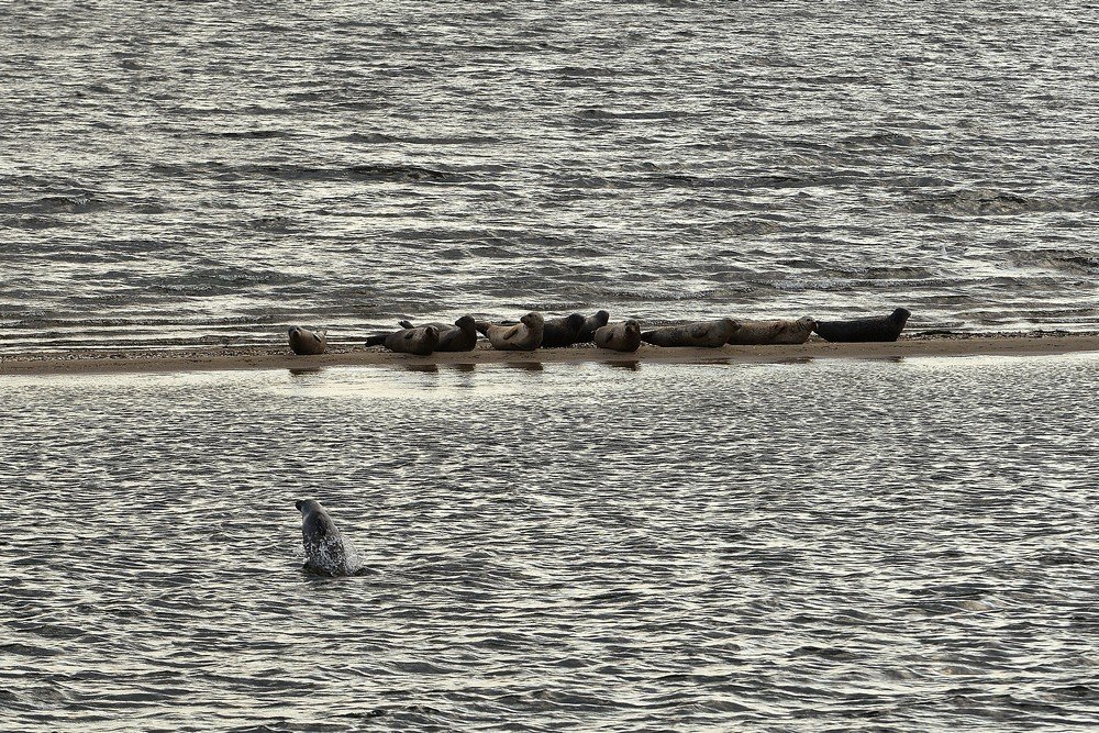 Sådan var det også i år, og denne gang var det Samuels Frederiksens sidste koncert af den slags i det hele taget. Han og hustruen flytter nemlig fra Hvalpsund til Silkeborg, og dermed mister egnen et musikalsk ægtepar, som gennem årene har sat deres helt eget præg på det vesthimmerlandske. De har drevet restaurationen Ertebælgen i Ertebølle, og Samuel har været med i bl.a. Hvalpene, som et Hvalpsund-baseret orkester, jeg havde fornøjelsen af at fotografere for mange år siden. Gennem de seneste år er det også blevet til populære spil-sammen aftener på Fiskegården i Hvalpsund, og så har Samuel troligt spillet solen ned på sin bænk ved marinaen - ikke hver aften, men mange aftener fra maj til august. Lørdagens koncert var begunstiget af rimelig godt vejr, efter at det ellers havde silet ned dagen igennem. Fra en lille udsigtsplatform trakterede Samuel, og hans søn Alan, med kendte melodier udsat for cornet og trækbasun. Publikum nød musikken på færgens dæk, hvor et par bilister, som bare skulle over sundet, fik sig en ekstra oplevelse med på vejen. En flok på 15-20 sæler samledes på tangen ved Sundsøre en halv times tid før koncerten, gad vide, om rygtet har spredt sig også i sælkredse. Jeg fik i alle tilfælde nogle af mine første sælbilleder fra Mary, bl.a. dette, hvor en sæl leger i vandet, medens de andre har deres på det tørre.