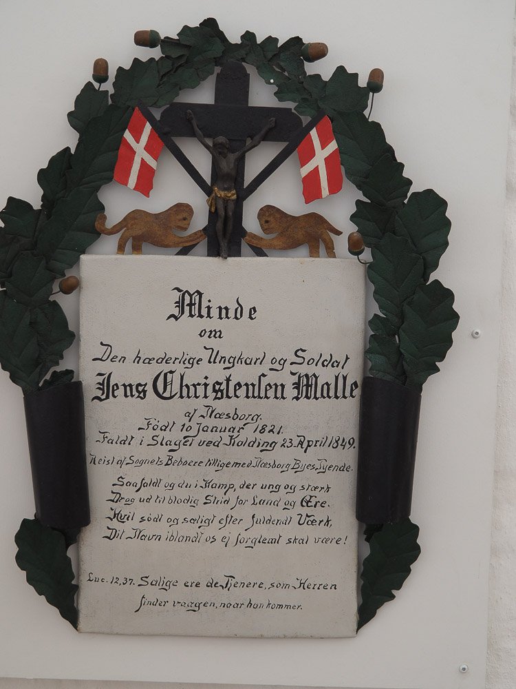 Næsborg Kirke er en typisk romansk kirke fra 11-1200 tallet. Kvadersten og hvidkalkede mure og tårnet mod vest. Kirken var åben, så jeg kiggede indenfor og bemærkede især de specielle mindetavler fra 1800-tallet, som hang inde ved orglet i bunden af tårnet. På pladerne er der tekster, som mindes brave mænd og kvinder fra egnen, f.eks. “Den hæderlige ungkarl og soldat” Jens Christensen Malle, som faldt i slaget ved Kolding i 1849.