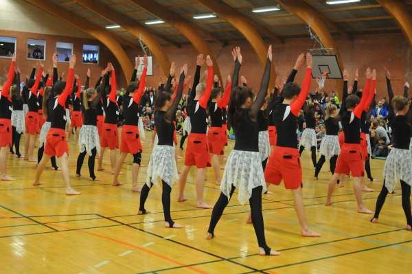 Nogle gange byder sådan en lørdag på 2-3 opvisninger i forskellige haller, men i dag er der kun en enkelt på programmet. Til gengæld er vi med allerede fra indmarch og til slut. Derved får eleverne også en fornemmelse af det arbejde, som udføres i en lokal gymnastikforening, som denne dag har alle sine hold i aktion på gulvet - plus altså det store gæstehold fra HCI.