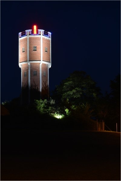 Nu da jeg havde udstyret med, blev det også til et stop ved vandtårnet i Farsø - som man kan se, er the blue hour slut og nu er nattehimlen sort som kul.