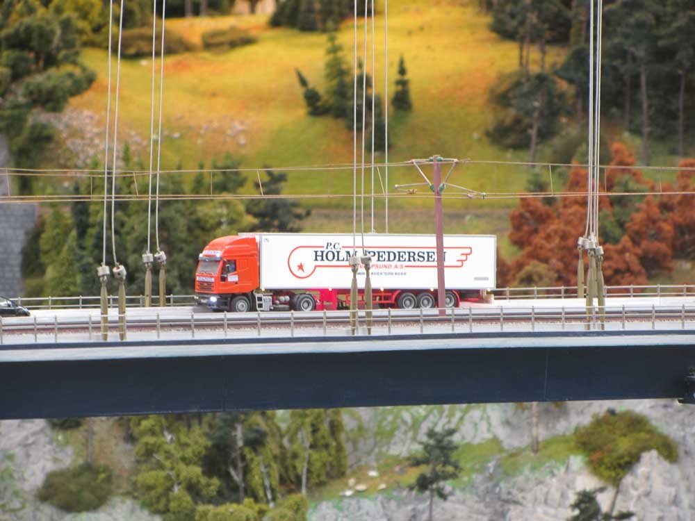 Som vesthimmerlænding var det ganske nostalgisk at betragte den flotte model af Lillebæltsbroen, hvor 2 lastvognstog fra det nu hedengangne vognmandsfirma PC Holm Pedersen er på vej over broen - begge biler med den karakteristiske orange bemaling, som man tidligere kunne opleve på landevejen rundt om i Europa.
