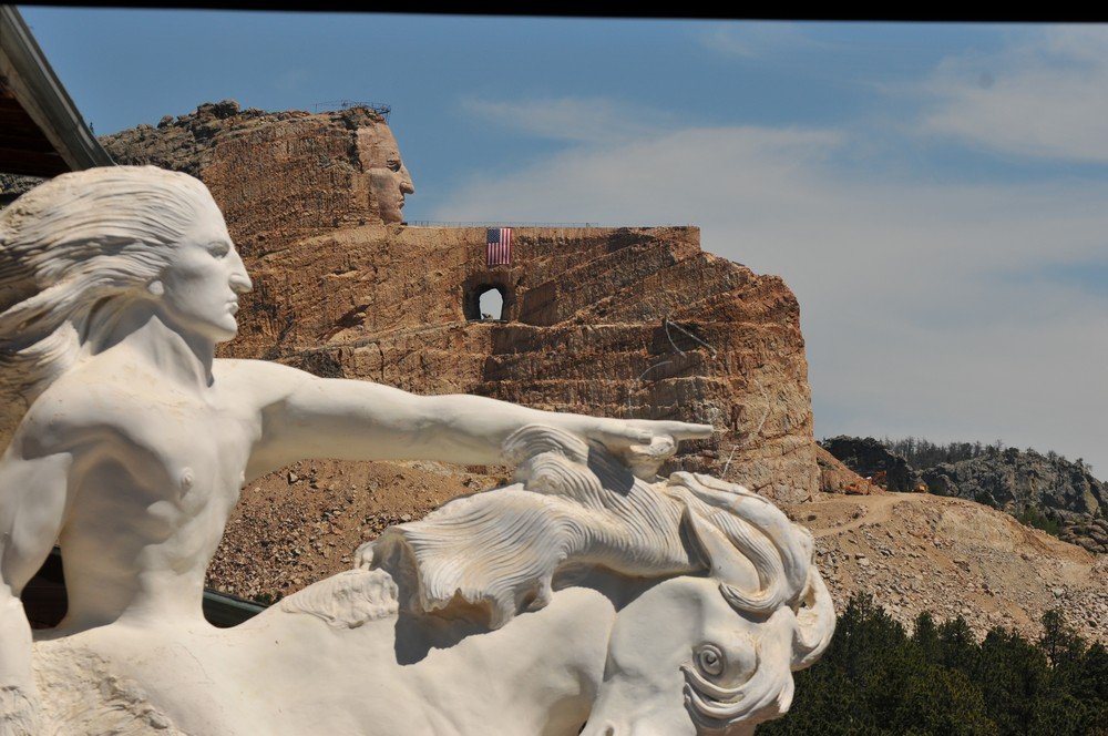 Ansigtet på Crazy Horse er færdigt, og man er nu i gang med hans arm,som skal pege ud over Black Hills - indianernes land. På bjerget har man optegnet konturerne af den hest, som Crazy Horse rider på. Når det hele står færdigt om måske 100 år, vil skulpturen være mere end 200 meter lang og 175 meter høj - den største i verden.