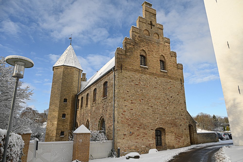 Kirken og kirkegården tog sig smukt ud i det hvide vinterlandskab, hvor solen var med til at forstærke det smukke syn.