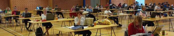Normalt er det høj latter og glade råb, som lyder i hallen, men til disse seancer er det kun computernes stille snurren og prøvevagternes forsigtige fodtrin mellem et virvar af forlængerledninger, som høres. Eleverne sidder i et væld af mere eller mindre behagelige stillinger og arbejder med prøveoplæggene - mange med musik i ørene via små headsets. Det fører til en pudsig situation, da en af pigerne lever sig ind i musikken og begynder at nynne højt. Det giver anledning til en del fnisen omkring hende og en lettere løftet pegefinger fra prøvevagten, som dog også selv må trække på smilebåndet - rart med lidt afveksling til sådan en vagt, som i visse perioder godt kan være en smule kedsommelig.