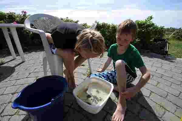 Morten havde en klassekammerat, Maria, med herud, og de fik en del tid til at gå med at fange rejer, hundestejler og krabber nede i fjorden. Men ikke nok med det - de kom også hjem med fangsten, som de kogte og tilberedte, så vi alle kunne smage friskfangede Limfjordsrejer. En udsøgt delikatesse, som vi nød, hvorimod jeg ikke havde den store lyst til at smage de kogte snegle, som de også diskede op med. Ja, på det punkt er jeg godt nok en kylling...