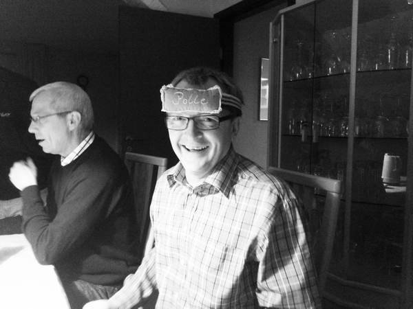 Ved festen forleden kunne Polle så hive den legendariske gave frem fra gemmerne til et festligt gensyn - der blev ikke brug for den, men bloggens læsere skal da ikke snydes for et par billeder. På det ene er det min gamle skolekammerat Søren Kristensen, som demonstrerer, hvordan sådan en ting skal bæres.