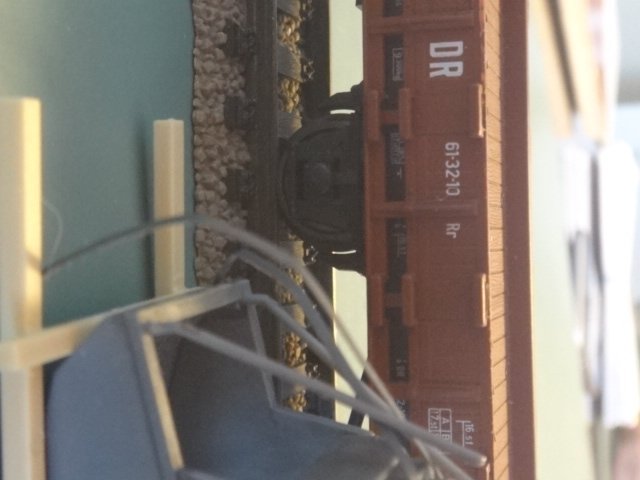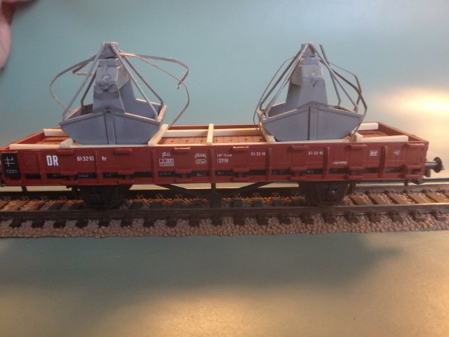 Sjov, ældrfe >PÅiko-model af østtysk litra Rr-vogn, læsset med to grabber til kulkraner (uden funktion), Vognen er intakt, men uden originalemballage og derfor meget billig.