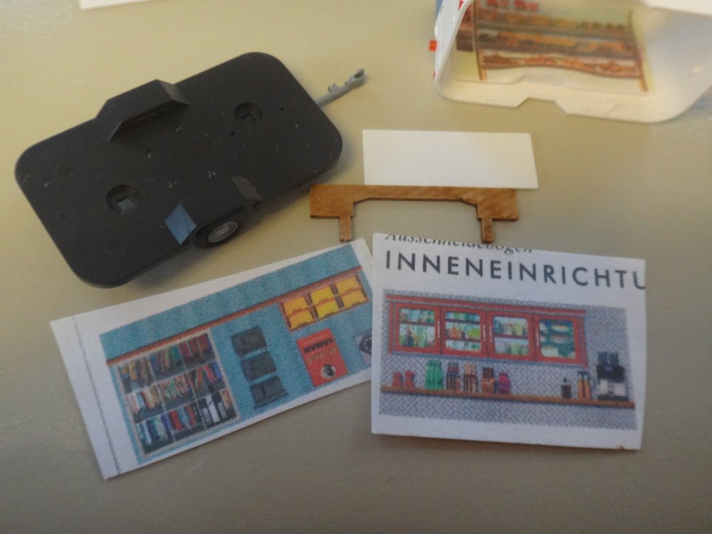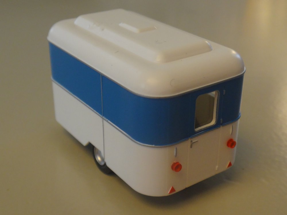 Lille campingvogn indrettet som salgsbod med bordplade, dekorationsark og tagskilt asf træ til valgfri montering. Busch-model skala 1:87.