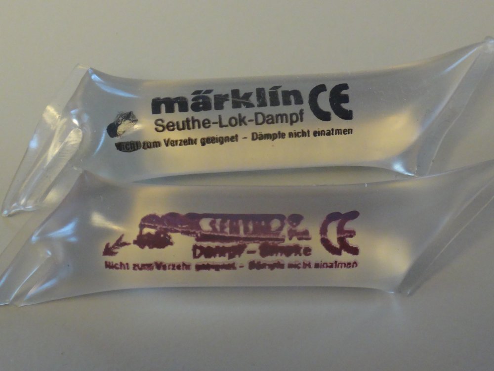 To små ampuller med dampolie fra Märklin og Seuthe. Ampullerfne er identiske i udførelse, men med forskellige påtryk. Sælges kun samlet.