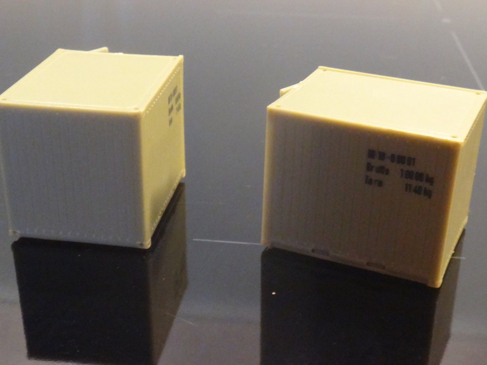 To små Piko-containere, epoke IV-VTo små, kubiske containere med oplukkelige døre. Den ene dør mangler dog på den ene container.