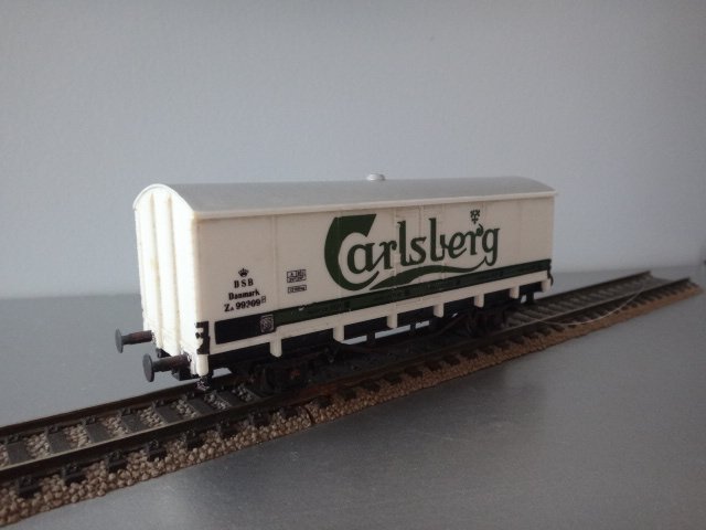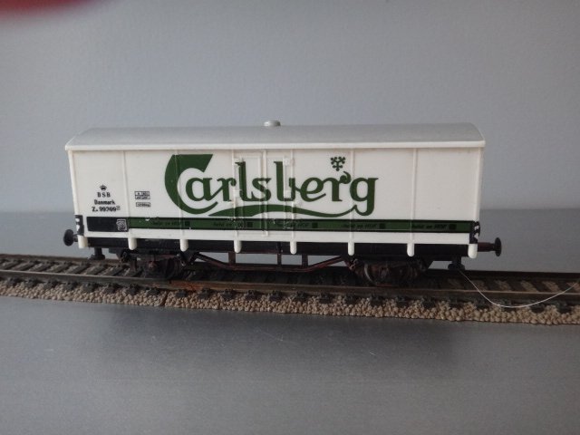 Jouef-vognkassen er ikke helt korrekt til en dansk Carlsberg-vogn, men påtrykkene er i orden - for det meste. Vognen er litreret ZA 99 309 og har logotypen i den daværende, mørkegrænne farve, mens "Helst en HOF" desværre er næsten ulæseligt. På taget sidder en overflødig ventilationshætte (faststøbt).