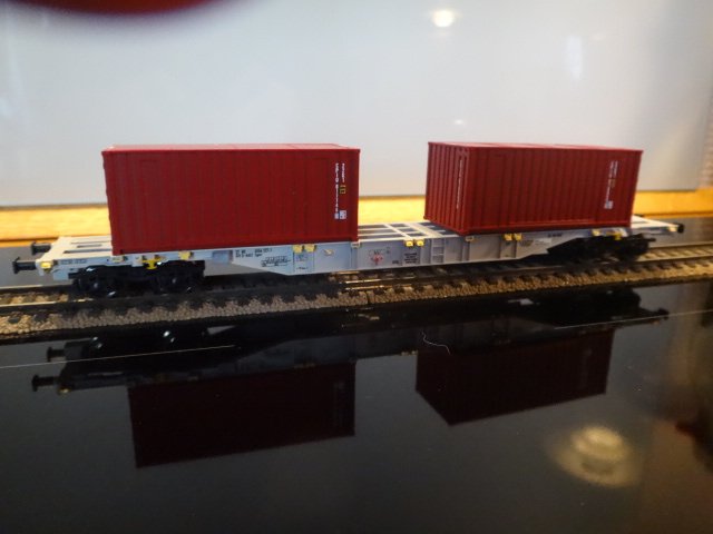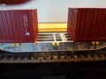En lang, moderne grå containervogn litra Sgns med to mørkerøde containere. Roco-model, epoke VI. Enkelte dele til eftermontering.