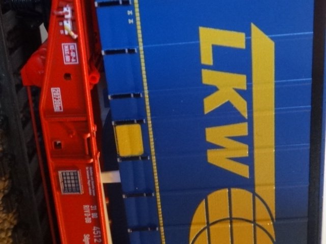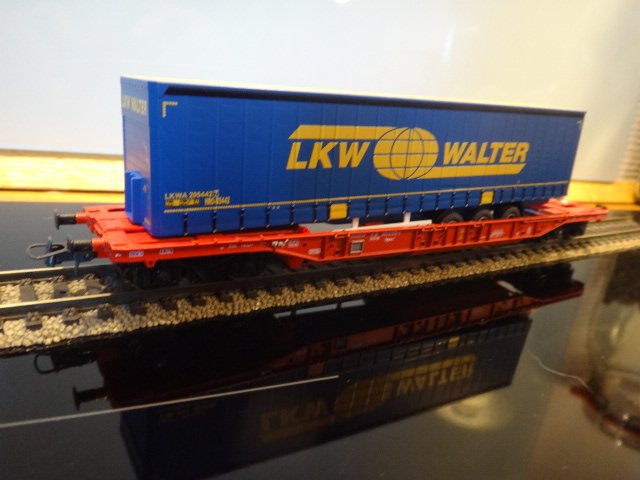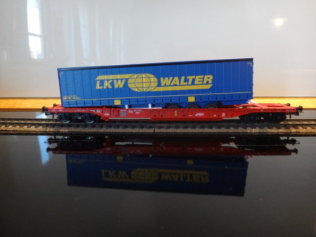 Roco-model med rød bærevogn med LKW-sættevogn. Utallige løsdele til eftermontering. Epoke VI-model - Walters-sættevogne ses næsten hver dag her i landet.