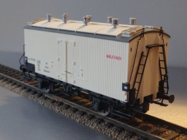 IKG-kølevogn fra DSB - en anderledes model med specielle tagventilatorer. Lodrette bræddevægge, bremseplatform, gavlstiger.