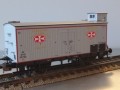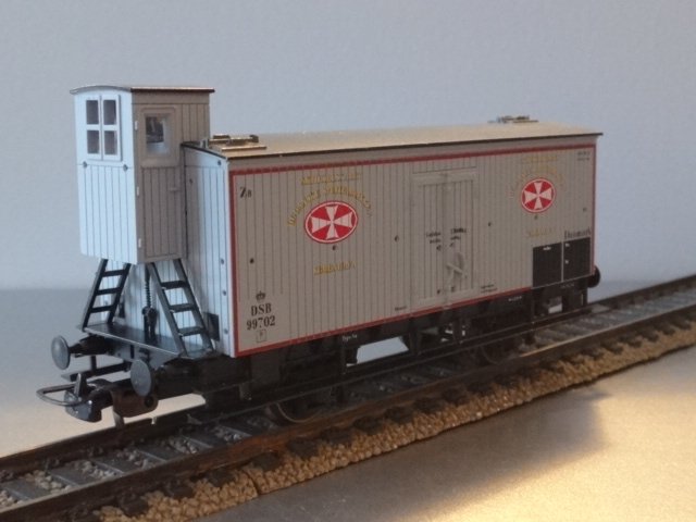 Piko-model af en gærvogn fra D.D.S.F. - grå med omfattende påtryk. Desværre er det flotte emaljeskilt med malteserkorset blot trykt på vognsiderne - det burde og skulle have været et fysisk trykt metalskilt, hvilket ville have hævet vognen.