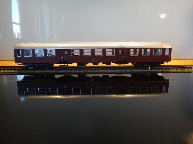 Vinrød Bn-passagervogn litra Bn fra DSB med övergangslitrering cirka 1968-73. Det var i løbet af denne periode, at DSB skiftede fra vinrøde (brune) passagervogne til det postkasserøde design, og hvor den gamle statsvirksomhed blev et moderne ledet foretagende med ny energi og vitalitet.