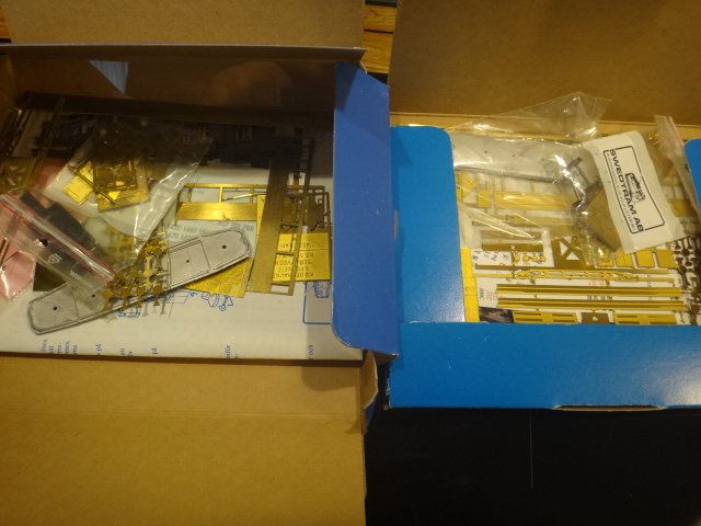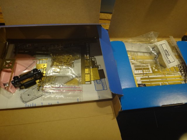 De to æsker indeholder alt til byggeriet - drev, vognkasse, indretning osv. af ætset messingplade, tag af støbt materiale med høj vægt, inkl. byggevejledning og skilte/linienumre.