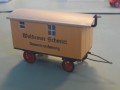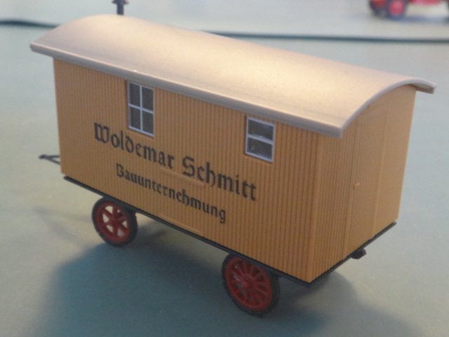 Skurvogn i gammnel stil med lodrette planker som vægbeklædning. Plastmodel fra epoche med tysk tekst. Spinkel trækkrog, røde egerhjul med gummidæk, skorsten.