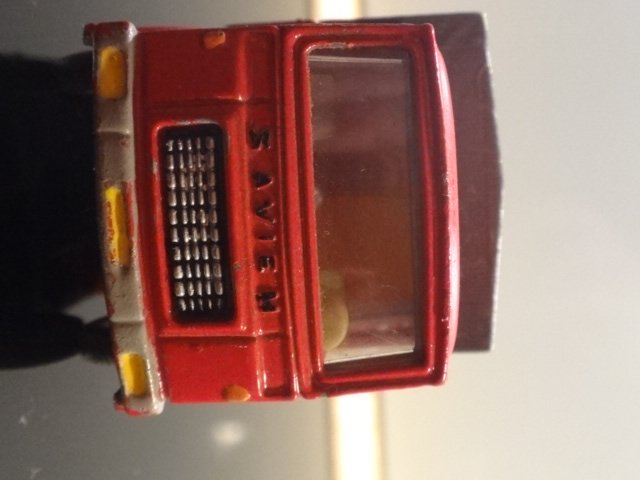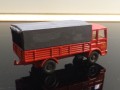 Model f Saviem-lastvogn med DSB-symbol på dørene. Lastvogn med presenning. Hjulene udskiftet med rigtige typer. Ombygget majorette-model. Epoke IV.