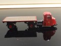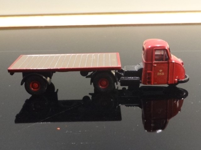 Mørkerød Scammel-sættevogn med DSB-markering. Scammel-sættevognene fandtes også i Danmark, hvor et mindre antal blev brugt, blandt andet af dagbladenes fællesdistribution af papirruller. Her er en model i DSB-bemaling..
