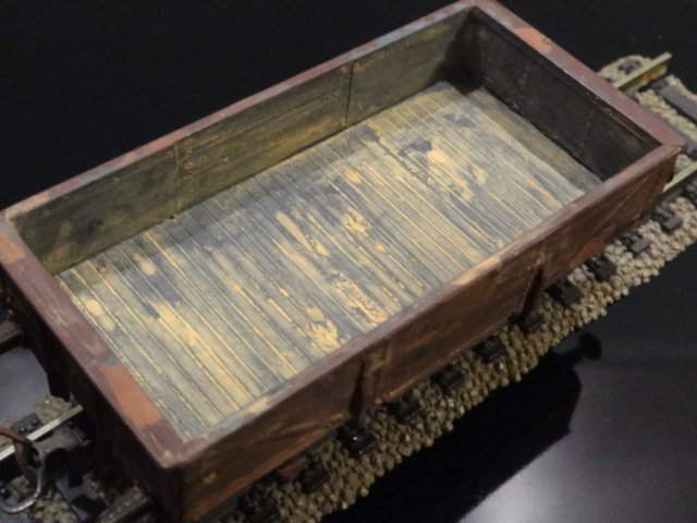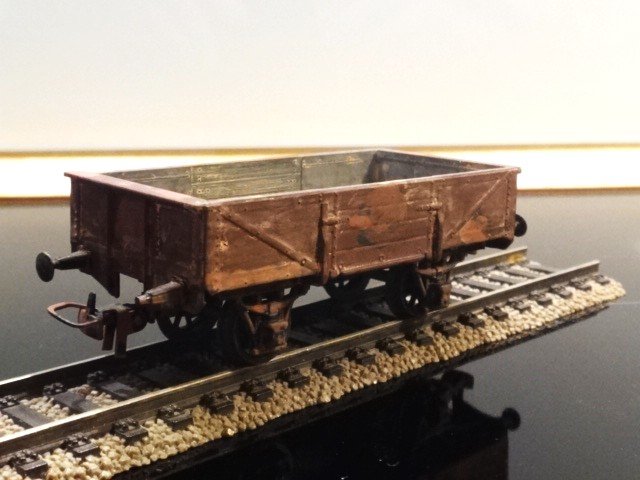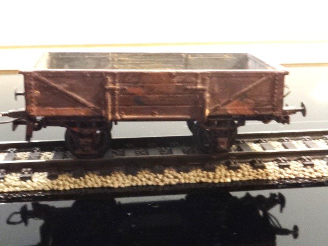 Lille, åben godsvogn, stærkt patineret. Med faste koblinger. Vognen har mig bekendt ikke noget kendt forbillede, men kan passe ind som intern firmasvogn på et jernværk eller anden, større virksomhed.