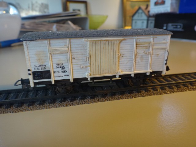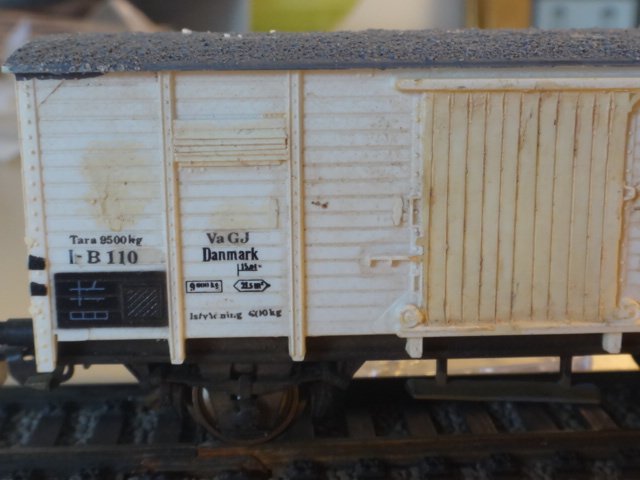 VaGJ I-B 110 - et eksempel på en lettere ombygning af en standard-godsvogn hos mange privatbaner. Voignen, som kørte på Varde-Grindsted Jernbane, er en Piko-modelm der er omliktreret og har fået ny skydedør i begge sider, fine håndbøjler og tilpassede jalousier.
