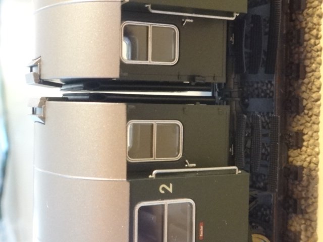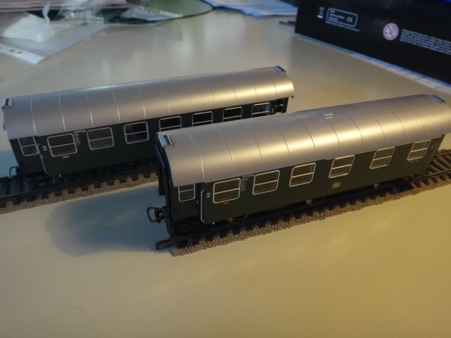 Sæt med to treakslede 'Umbau-Wagen', de klassiske ombygningsvogne, der prægede vesttyske sidebaner gennem mange år, ofte trukket af mindre tenderlokomotiver (BR 64, 86) eller senere af V 100-diesellokomotiver.