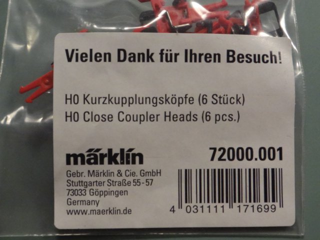 Pose med nye koblinger fra Märklin. Koblingerbne er røde for at adskille dem fra de hidtidige typer. Udleveret på Nürnberg-messen 2019.