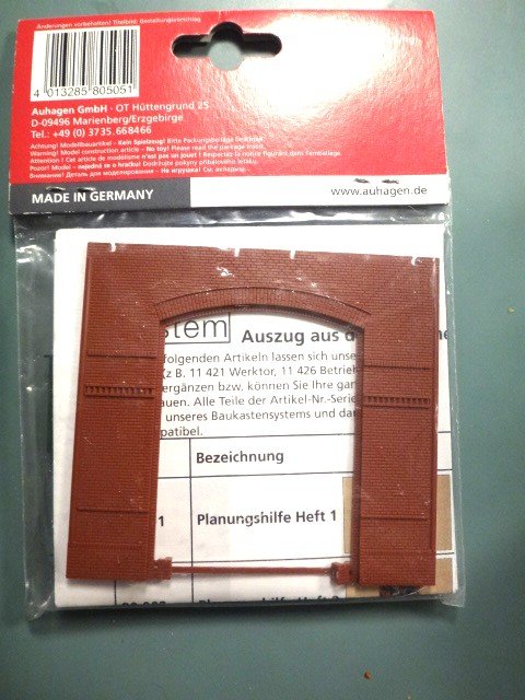 Pakning med to store, mørkegrønne remiseporte samt vægmodul til portene. Murværk rødbrunt. Fra Auhagens modulserie.