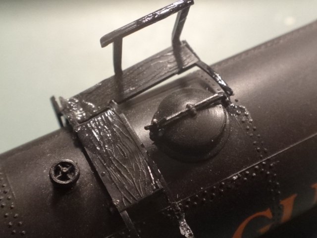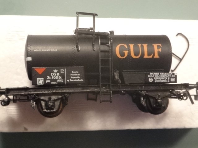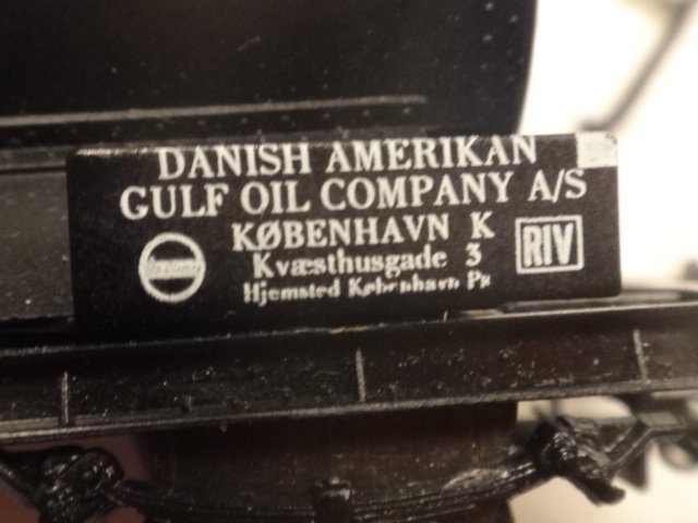 Model af en sort Gulf-tankvogn med nogle fejl og mangler. På tanken mangler en del af rækværk og gangbro, og på litreringspladen er nummeret forsøgt ændret (sidste ciffer overmalet).