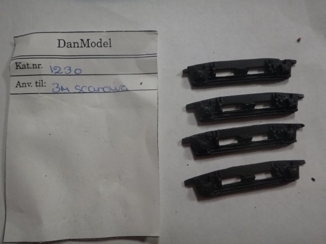 Pose med fire styk Scandia 3 meter bogiesider, til montering på gladslebne andre biógier. DanModel-sæt, hjemmestøbte, lidt grove i det, men et eksempel pådansk 'køkkenbordsarbejde'.