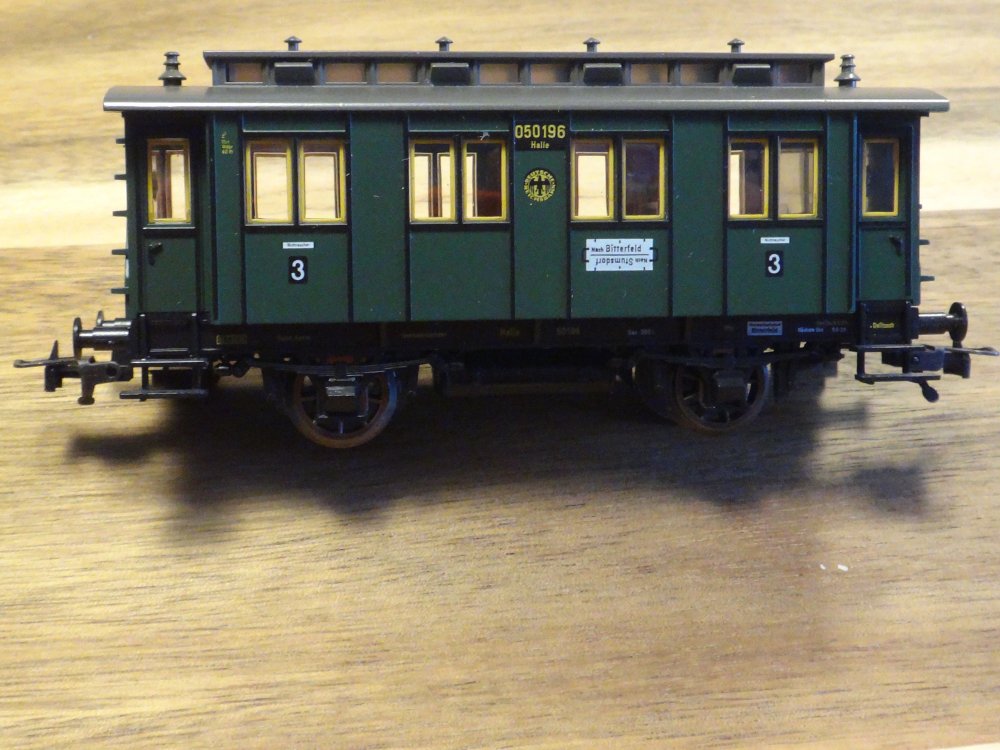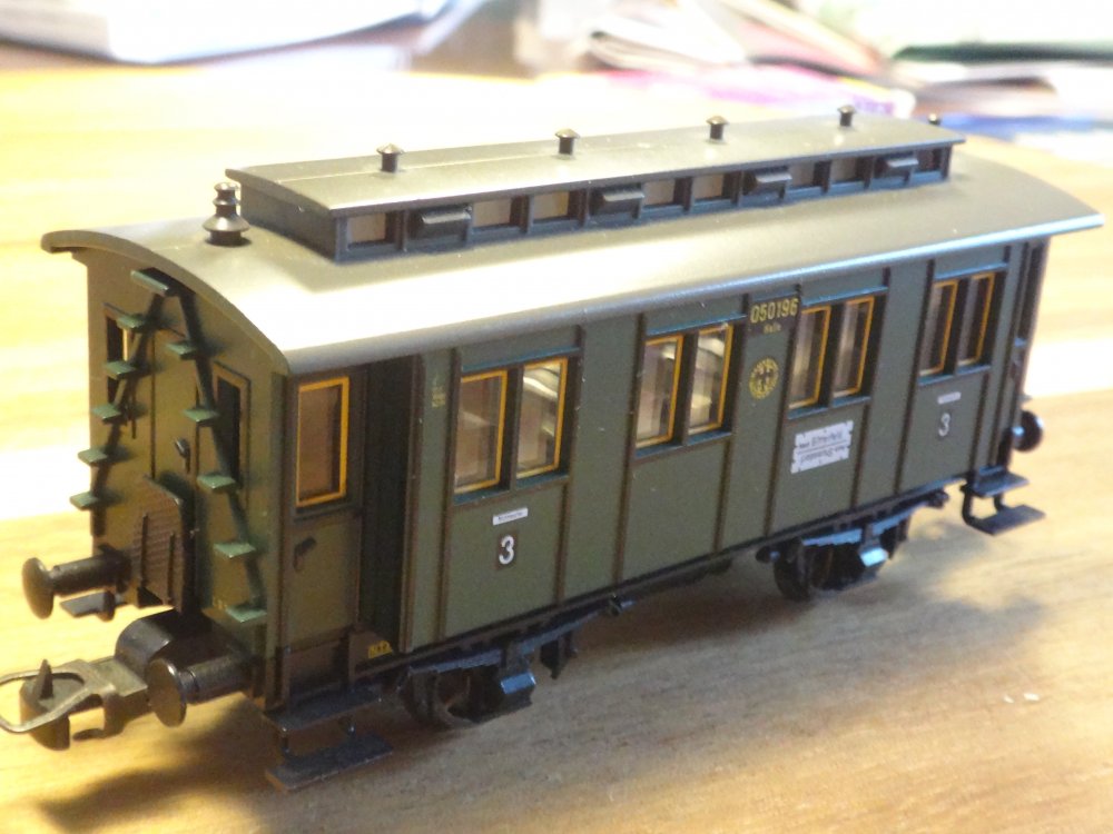 Lille, gammel tredje-klasses vogn fra DRG. Grøn model med tagrytter, egerhjul og lukkede overgange. Fleischmann-model i den kendte udførelse med alle detaljer støbt i vognkassen/ på taget. Udstyret medf A-koblinger, men uden NEM-skakte.