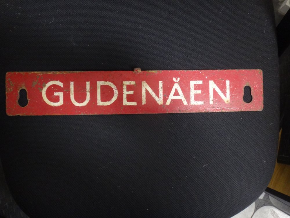 Gudenåen - mørkerødt lyntogsskilt fra DSB