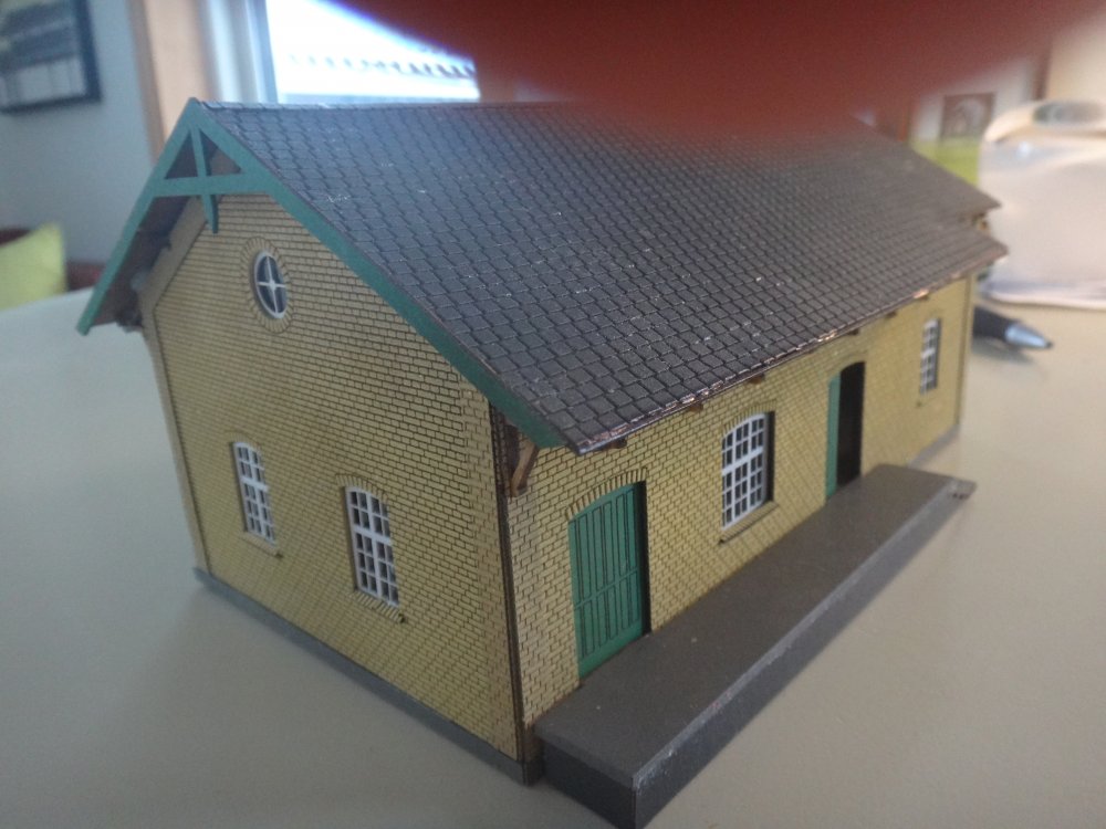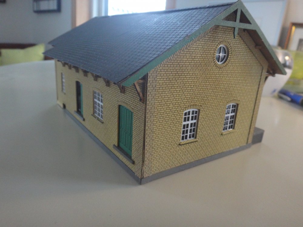 Klasssisk DSB-pakhus af gule sten, færdigsamlet hobby trade-byggesæt. Forbilledet siges at være fra Ribe og/eller Ringkøbing, og bygningen har realistiske proportioner - en flot konstruktion fra hobby trade.