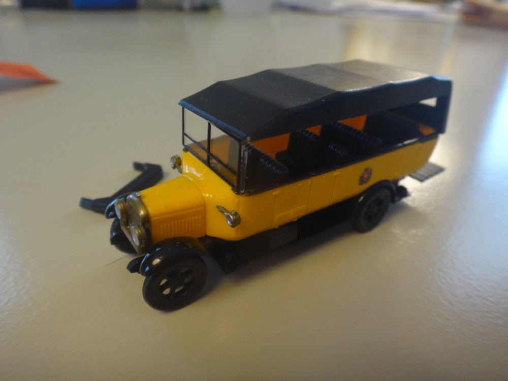Åben veteranbus fra den legendariske tyske virksomhed Roskopf, der var en sand pionér blandt modelfabrikanterne i de tidlige 1980'ere, hvor modelbilverdenen var præget af Wikings grove modeller og Pralinés ret primitive modeller.