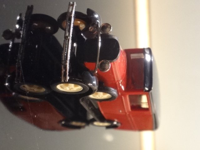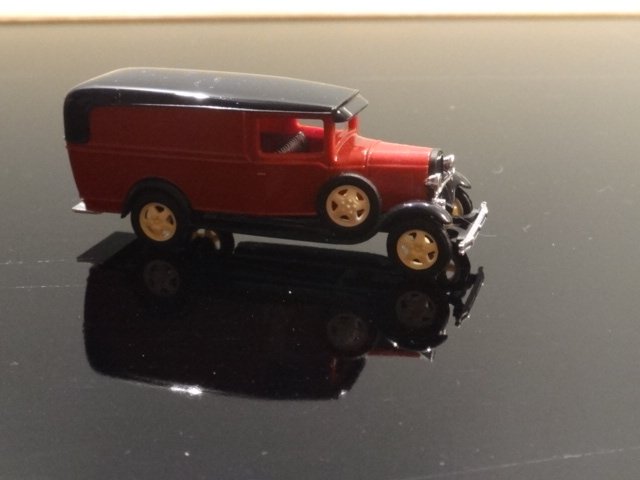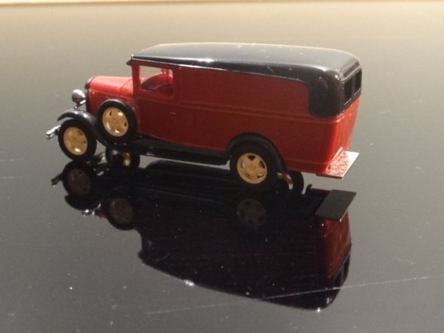 Rød/sort Ford AA-oldtimer fra 1930'erne. Uden reklamer, med spinkel lygteholder og fine detaljer. Typen kørte også her i landet, blandt andet som postbil i København.