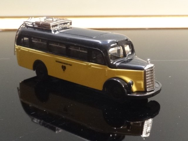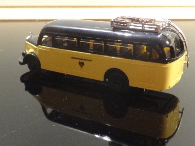 Klasisk Busch-model af Mercedes-Benz O 3500 i østrigsk udførelse. Lysegul/sort, fuld indretning. Fritstående lygter, tagbagagebærer med bagage og buet lejder til taget.