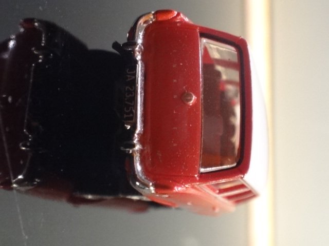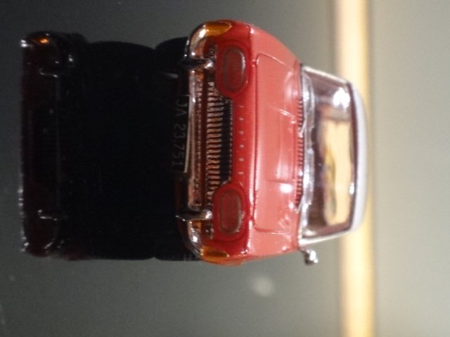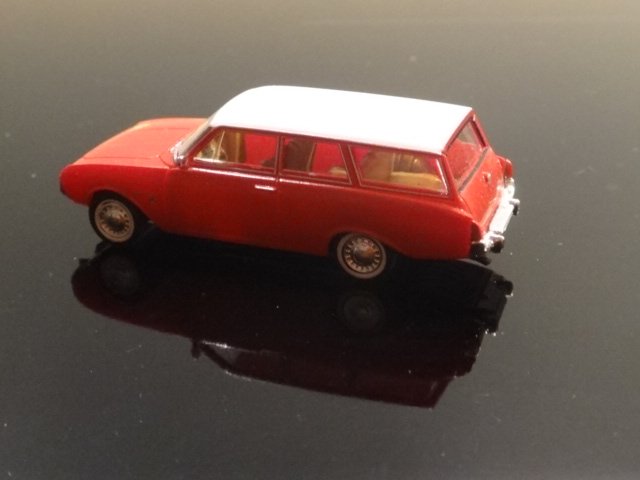 Brekina-model af den smukke Ford Taunus 17 M Turnier. Tofarvet udgave rød/hvid med flotte kromdetaljer. Med bornholmske nummerplader (JA 23,251).