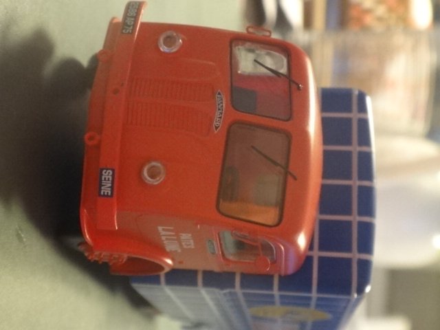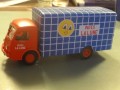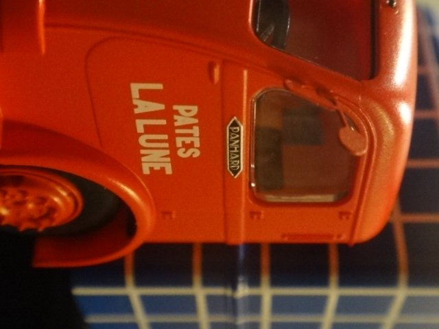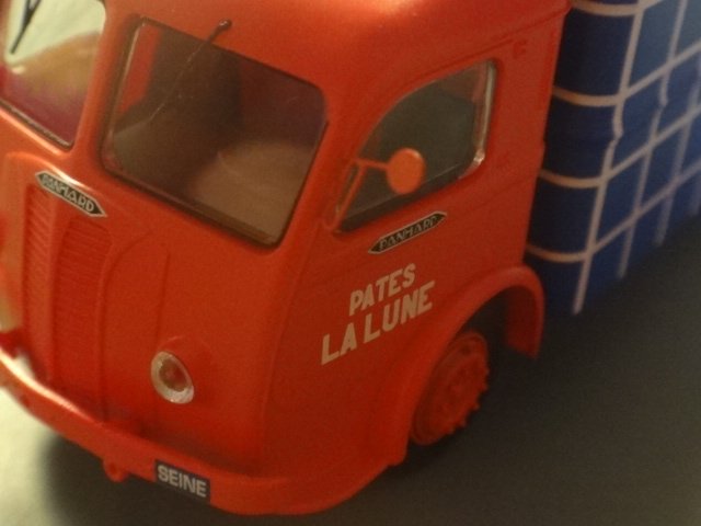 Skøn model af en fransk klassiker, Panhard-Movic-kasssevogn fra firmaet "Pate la lune", altså vel noget med en slkalgs måne-småkager. Indteressant, blåternet varekasse, der ligner Irmas kaffeposer...