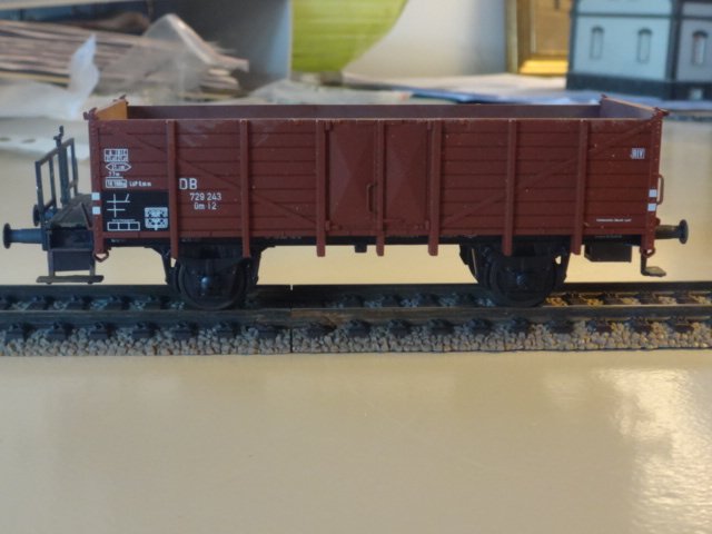 Åben, højsidet godsvogn litra m12 fra DB, med bremseplatform. Epoke III-model, standardtype. Uden original emballage.